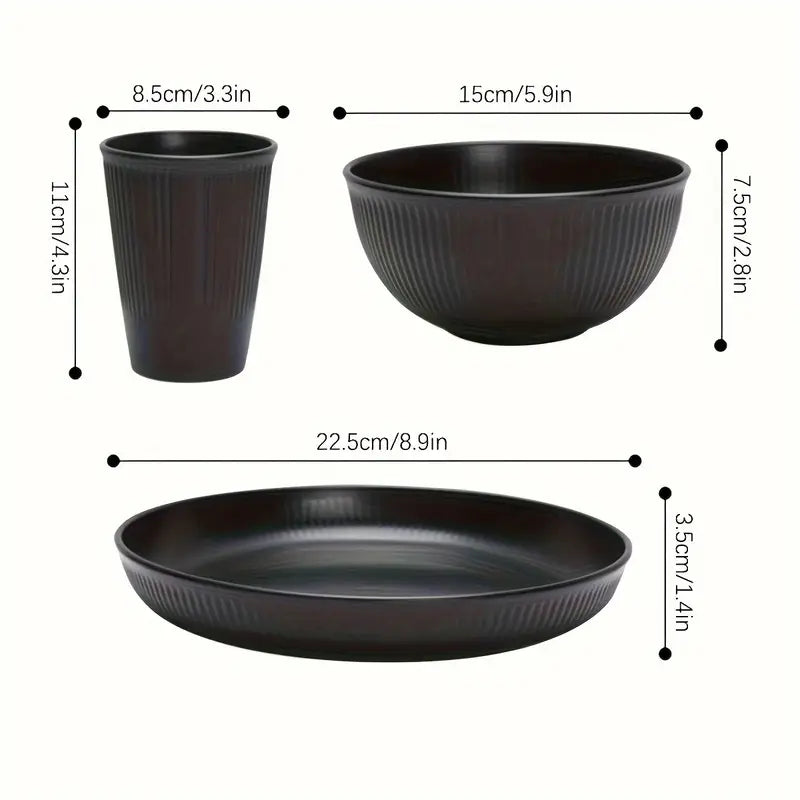 Muuda igapäevased toidukorrad ja erisündmused praktilisemaks ja stiilsemaks 18-osalise purunematu nõudekomplektiga, mis sisaldab musti taldrikuid, kausse ja tasse. See vastupidav ja kergesti hooldatav komplekt on nõudepesumasina- ja mikrolaineahjukindel, mistõttu sobib suurepäraselt igapäevaseks kasutamiseks nii kodus kui ka õues – olgu see matkamine, telkimine, piknikud või pidulikud koosviibimised.